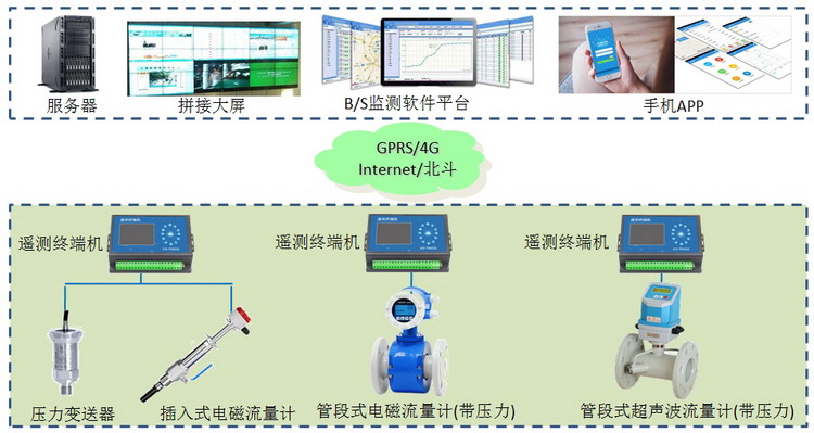 系統(tǒng)由設(shè)備層、傳輸層、通訊網(wǎng)絡(luò)和云平臺(tái)組成。設(shè)備層主要包括壓力變送器、流量計(jì)、太陽能供電組件、立桿支架等設(shè)備構(gòu)成;傳輸層即遙測(cè)終端機(jī),主要實(shí)現(xiàn)數(shù)據(jù)采集和數(shù)據(jù)傳輸邏輯;通訊網(wǎng)絡(luò)有4G無線傳輸、有線寬帶等方式;云平臺(tái)包括云服務(wù)器、軟件平臺(tái)和手機(jī)APP等部分組成。