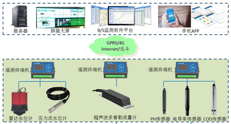系統(tǒng)由設(shè)備層、傳輸層、通訊網(wǎng)絡(luò)和云平臺(tái)組成。設(shè)備層主要包括水位計(jì)、流量計(jì)、水質(zhì)傳感器、太陽能供電組件、立桿支架等設(shè)備構(gòu)成;傳輸層即遙測(cè)終端機(jī),主要實(shí)現(xiàn)數(shù)據(jù)采集和數(shù)據(jù)傳輸邏輯;通訊網(wǎng)絡(luò)有4G無線傳輸、有線寬帶等方式;云平臺(tái)包括云服務(wù)器、軟件平臺(tái)和手機(jī)APP等部分組成。