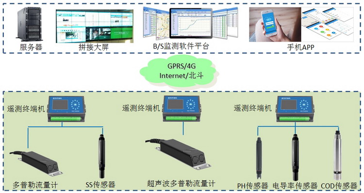 系統(tǒng)由設(shè)備層、傳輸層、通訊網(wǎng)絡(luò)和云平臺(tái)組成。設(shè)備層主要包括流量計(jì)、水質(zhì)傳感器、太陽能供電組件、立桿支架等設(shè)備構(gòu)成;傳輸層即遙測(cè)終端機(jī),主要實(shí)現(xiàn)數(shù)據(jù)采集和數(shù)據(jù)傳輸邏輯;通訊網(wǎng)絡(luò)有4G無線傳輸、有線寬帶等方式;云平臺(tái)包括云服務(wù)器、軟件平臺(tái)和手機(jī)APP等部分組成。